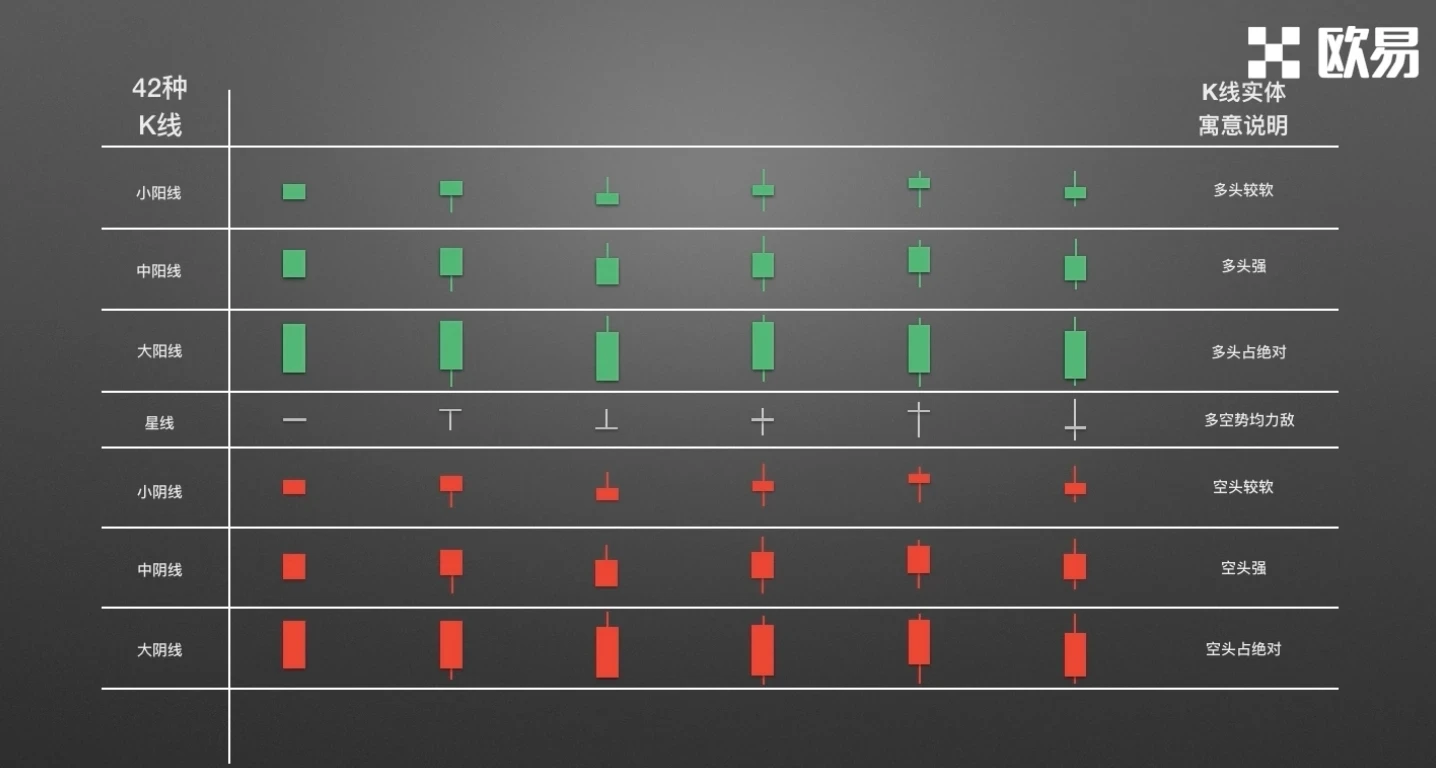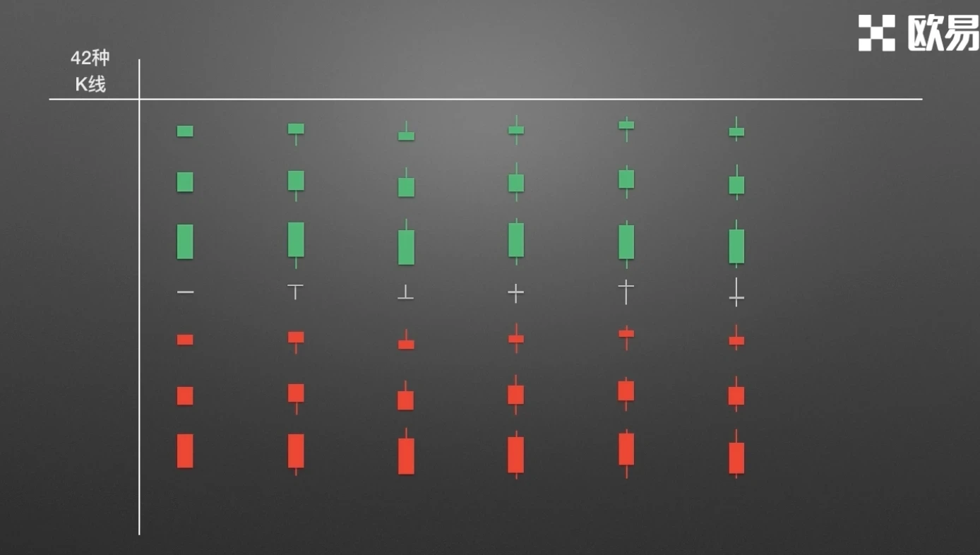 如图所示,我们将各式各样的K线有序排列在一起。横竖相乘,一共42种。我们先说明K线实体长短的寓意。