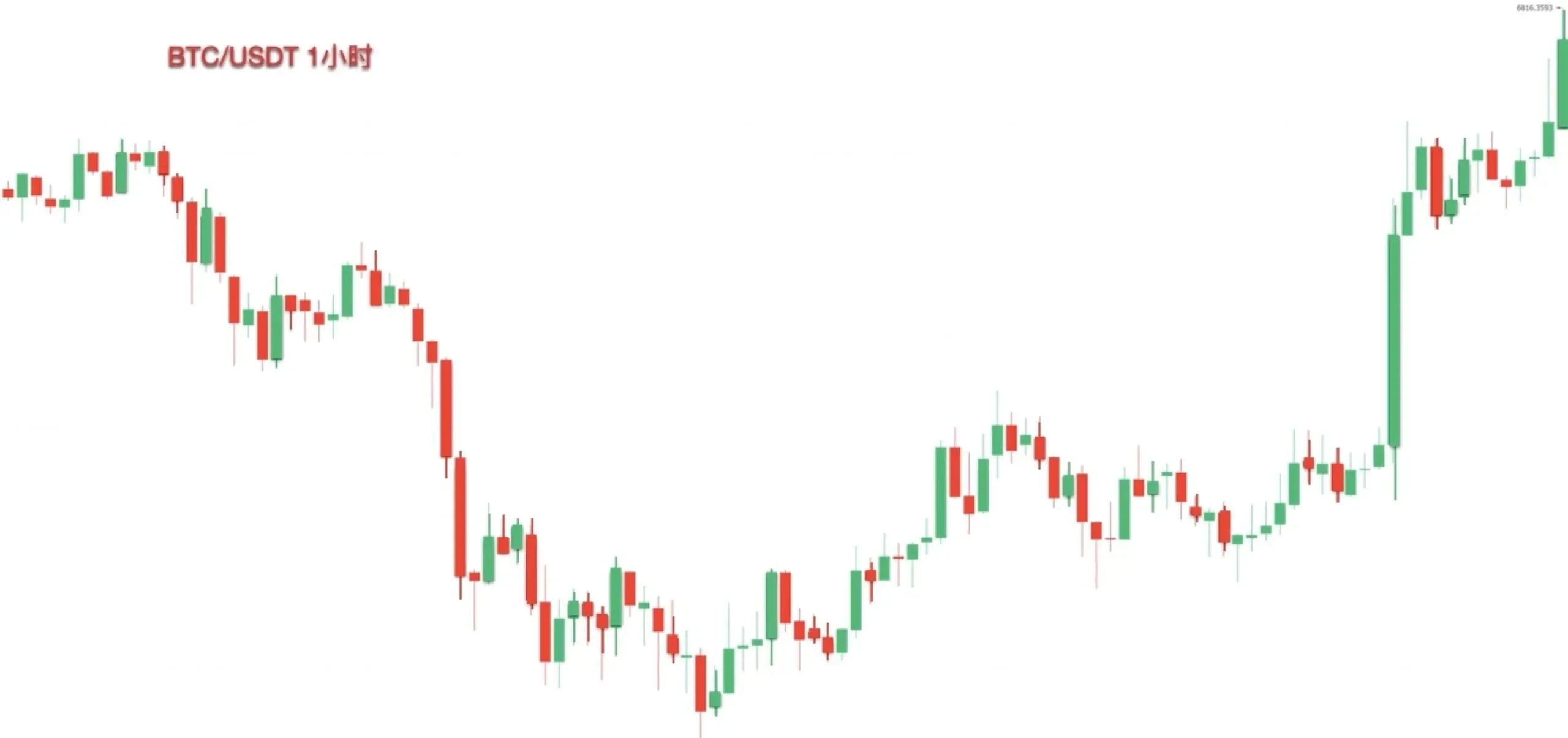 将无数组这样的K线排列在一起,就构成了我们常看到的价格走势图。截图来自欧易币币交易区BTC/USDT价格走势图。