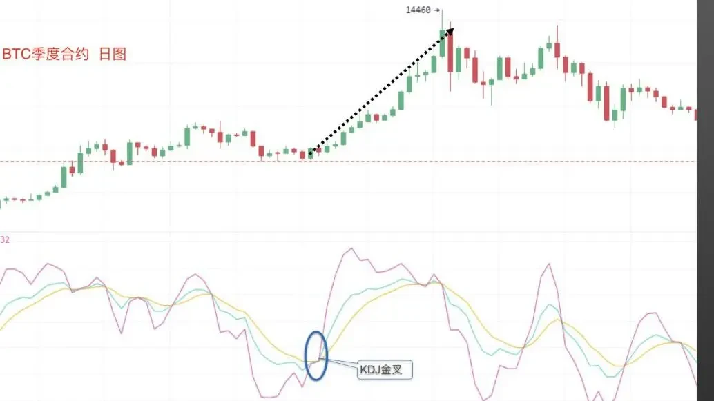 金叉案例:截图来自欧易 BTC季度合约日线图,如图中蓝圈位置所示,短周期的KDJ曲线自下而上与长周期的KDJ曲线交叉时,形成黄金交叉,称金叉,行情大概率上涨,如图中黑色虚线箭头所示的价格走势。