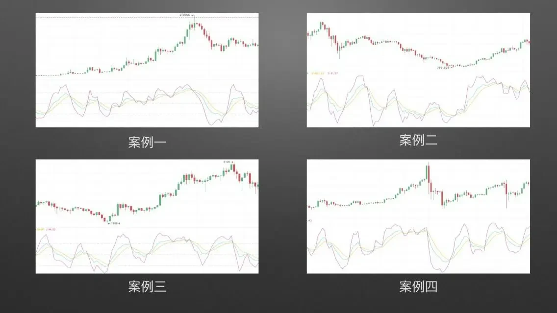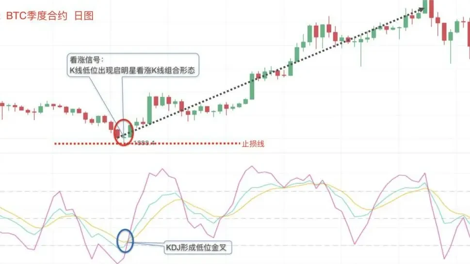 案例三:KDJ低位金叉与K线看涨吞没的应用,截图来自欧易 BTC季度合约日线图,币价不断下跌,低位出现前面课程第3期中介绍的启明星看涨K线组合形态,同时相对应的KDJ指标低位形成金叉,此为双重看涨信号,止损线可设在启明星看涨K线组合中十字星价格最低点,随后币价迎来一波快速上涨。