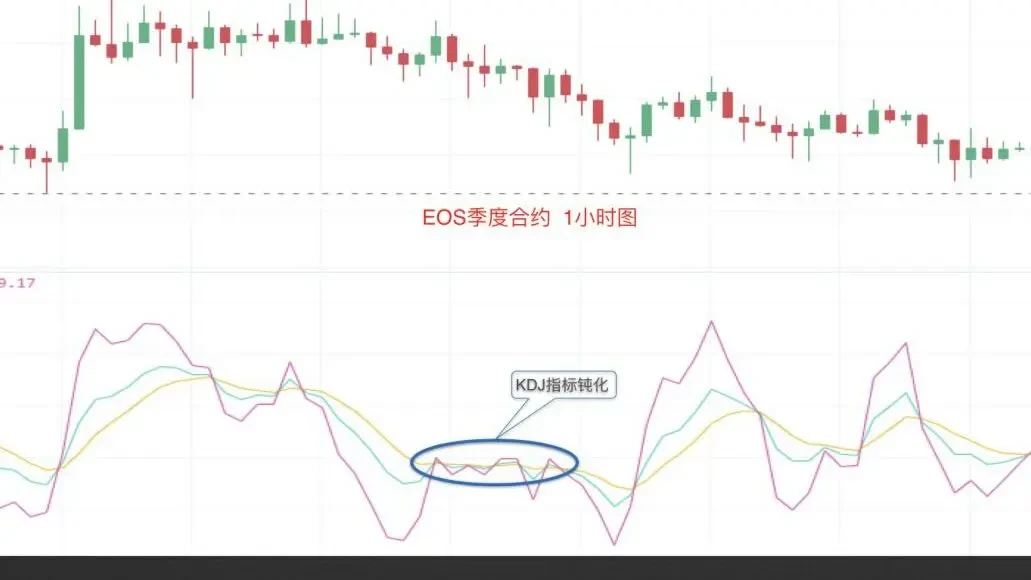 钝化案例:截图同样来自欧易 EOS季度合约1小时图,如图中蓝圈所示,币价按照某一趋势运行时,KDJ指标频繁地形成金叉或死叉发出买卖信号,呈粘合状,这样的现象称为指标钝化,当钝化出现时交叉信号失去了指导意义。