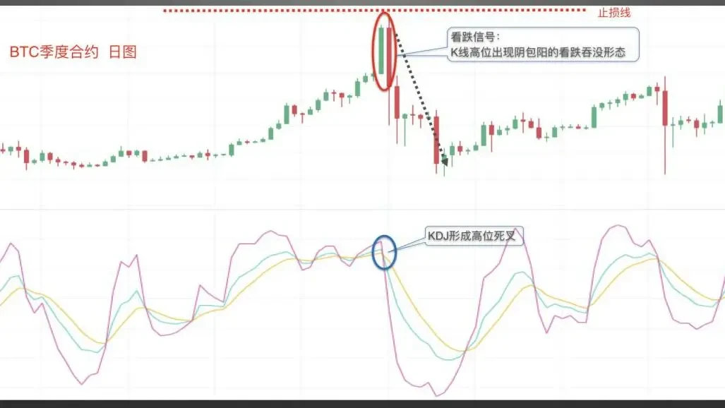 案例四:KDJ高位死叉与K线看跌吞没的应用,截图来自欧易 BTC季度合约日线图,币价不断上涨,高位出现前面课程第4期中介绍的阴包阳的看跌吞没K线形态,同时相对应的KDJ指标高位形成死叉,此为双重看跌信号,止损线可设在看跌吞没中中阴线最高点,随后币价迎来一波快速下跌。