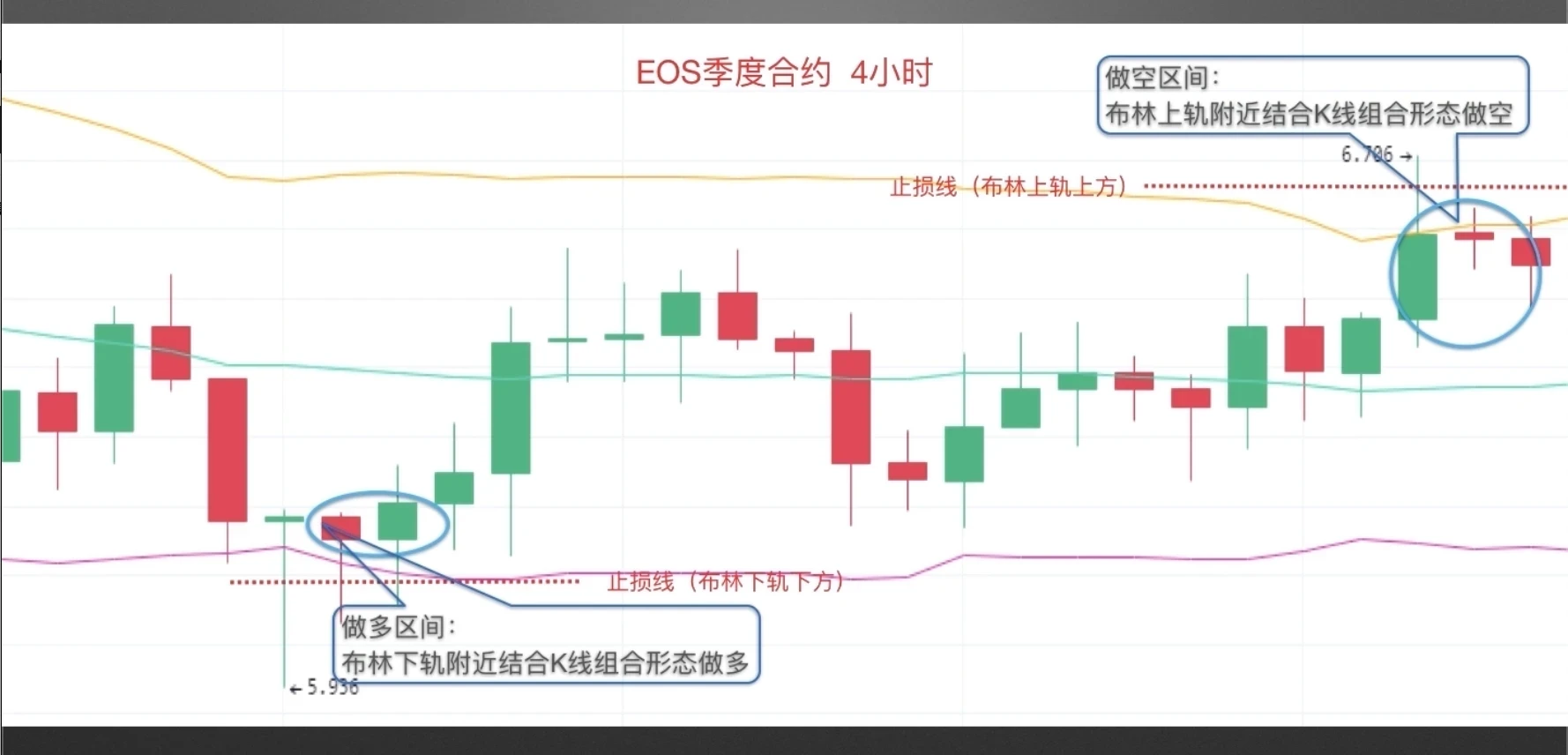 最后,震荡趋势案例·截图来自欧易 EOS季度合约4小时图,在震荡行情中,当K线有效跌破布林中轨后,若价格贴近布林下轨,同时出现第一章第三节讲到的启明星或看涨吞没等看涨K线组合,为看多信号,止损设在布林下轨以下;当K线有效突破布林中轨后,若价格继续贴近布林上轨,同时出现第一章第四节讲到的黄昏星或看跌吞没等看跌K线组合,为看空信号,止损设在布林上轨上方以上。