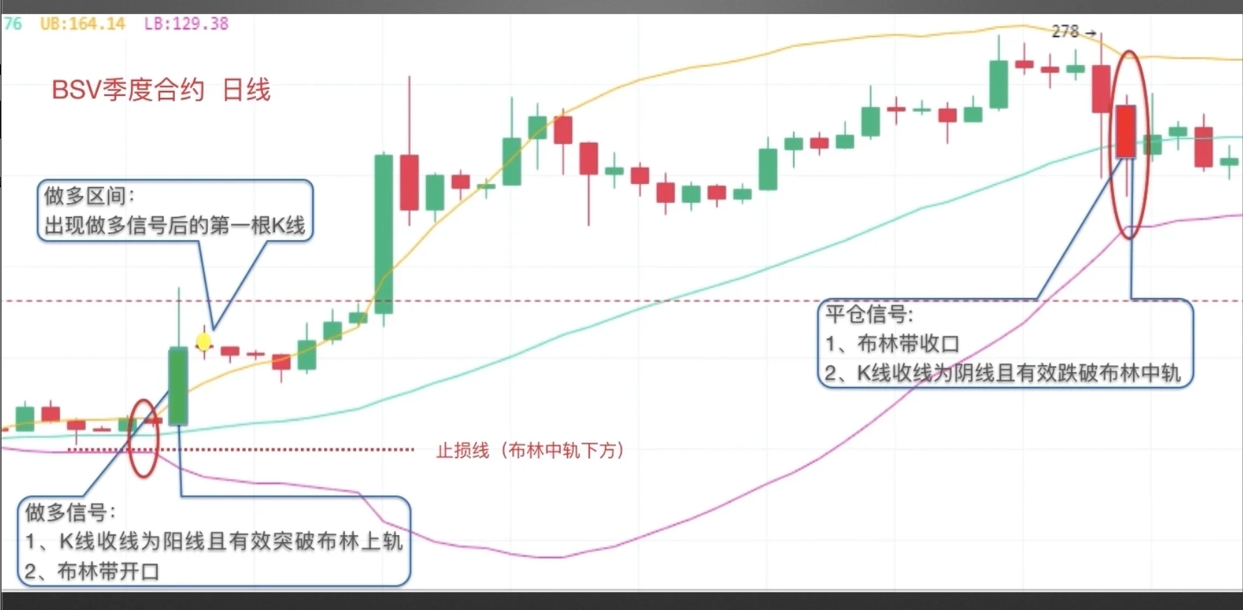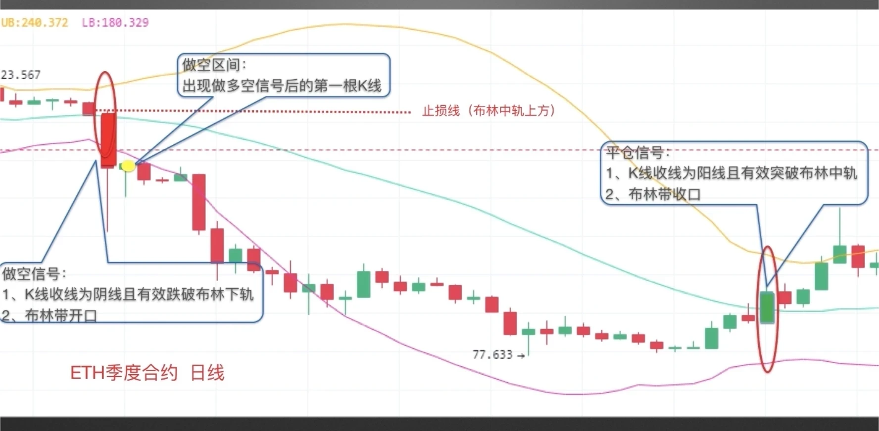 同样,下跌趋势案例截图来自欧易 ETH季度合约日线图,当中阴线有效跌破布林下轨,布林形成开口,出现做空信号,随后的第一根K线为做空区间(如图中黄色圆点标注的K线),止损可设在布林中轨上方(如图示红色虚线标注位置)。下跌行情中,币价始终在布林中轨下方运行,直至布林带形成收口,K线收线为阳线且有效突破布林中轨,形成下跌行情结束信号,建议平空单。