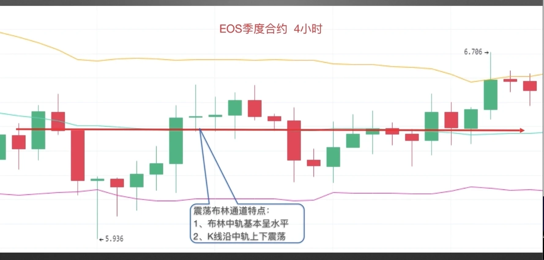 最后我们看震荡布林通道,截图来自欧易 EOS季度合约4小时图,当布林中轨基本呈水平走势,且K线围绕布林中轨上下震荡时,可归类为震荡布林通道。