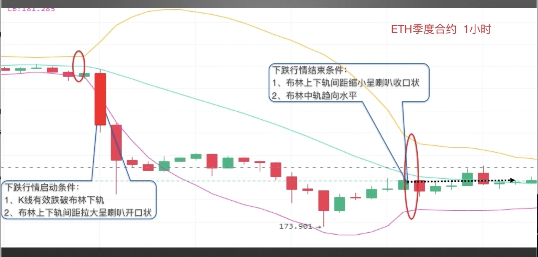 我们再来看一下震荡转下跌行情中出现的信号点,截图来自欧易 ETH季度合约1小时图,图中左侧为K线在布林中轨下方的窄幅震荡走势,随着中阴线K线有效跌破下轨,布林上轨与下轨间距明显拉大呈喇叭开口状,预示单边下跌行情将来临。之后K线始终在布林中轨下方运行,直至布林呈收口形态,且布林中轨趋向水平,预示此轮下跌行情终结,随后进入震荡行情。