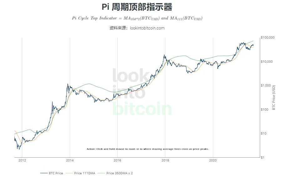 Pi 指标是分析师Philip Swift创建的直接指标。它使用 111 天移动平均线 (111DMA) 和新创建的 350 天移动平均线倍数,即 350DMA x 2(倍数是 350DMA 的价格值,而不是天数)。旨在用长期投资工具,显示在哪些时期买卖比特币会产生巨大回报。