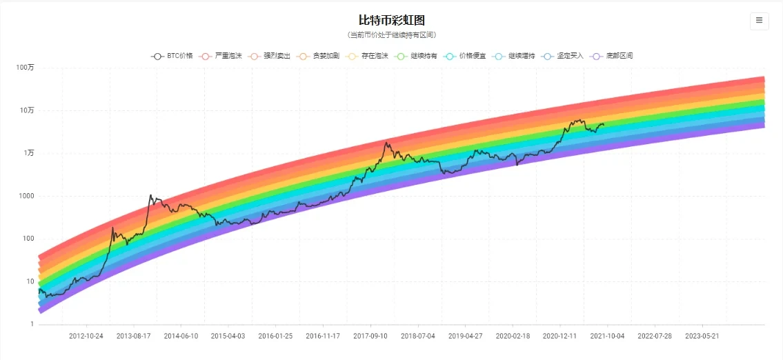 当币价位于彩虹带越靠近底部,代表投资价值越大;当币价越靠近彩虹带上方,代表泡沫越大,需注意风险。