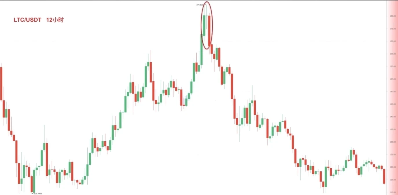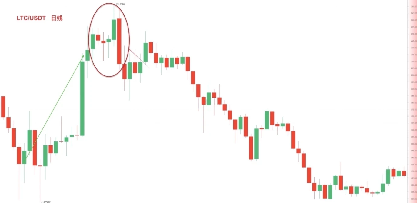 图一(截图来自欧易 LTC/USDT 日线图),币价大幅上涨后出现了一阴吞多阳的强劲看跌吞没组合后,币价出现连续下跌。