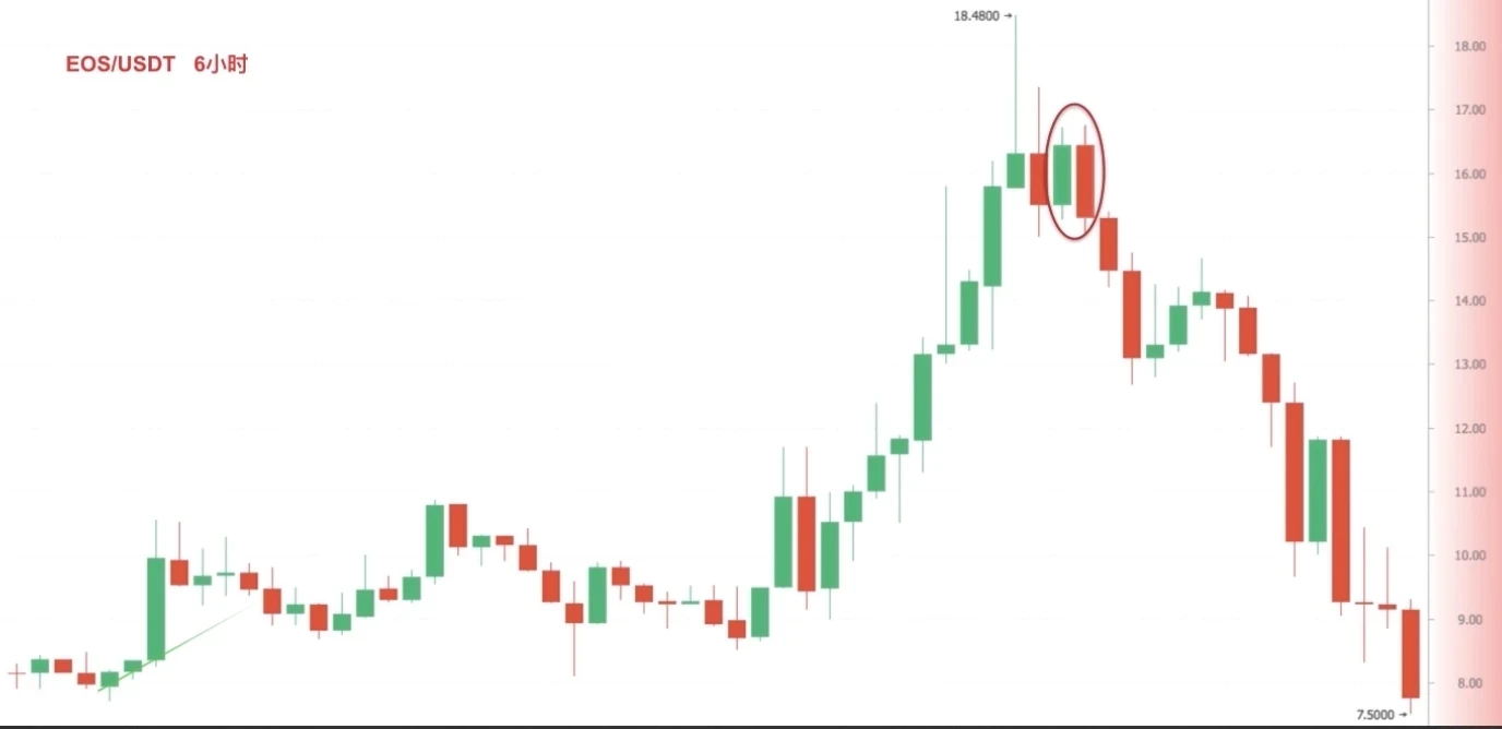 图三(截图来自欧易 EOS/USDT 6小时图),币价在连续大涨后,出现看跌吞没组合,随后展开大幅下跌。