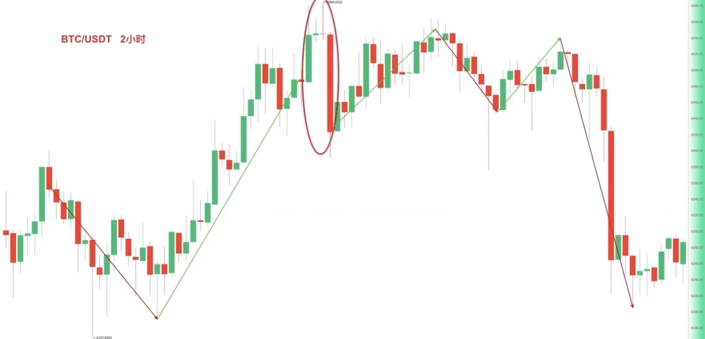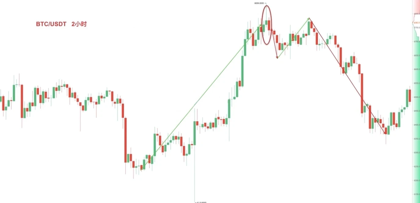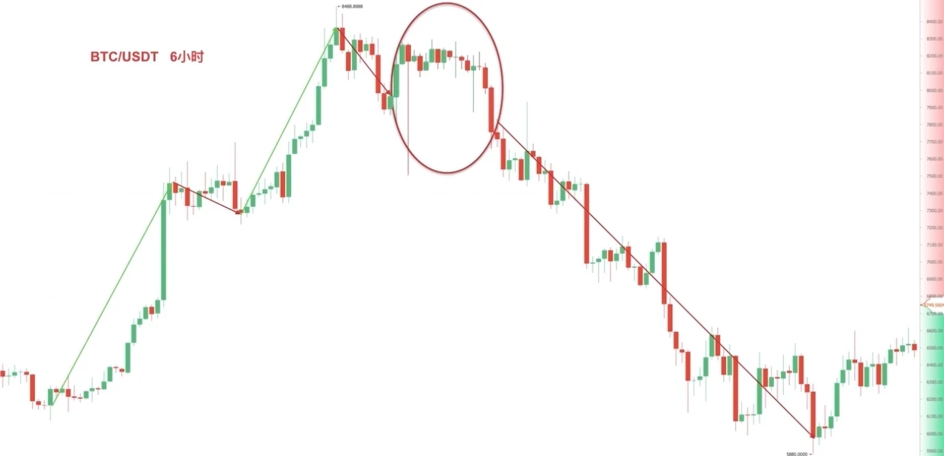 变化一,中间多根小K线带有长影线。截图来自欧易 BTC/USDT 6小时图,在大幅度上涨后出现塔形顶组合,之后币价连续下跌,并跌穿前期低点。