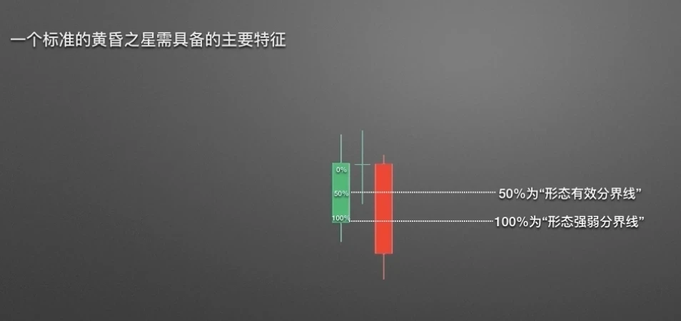 标准的黄昏之星由三根K线组合而成,首先是一根较大的阳线,随后紧跟一根类似“十字”的星线,第三根K线是一根较大的阴线。黄昏之星是否成立,对第三根阴线的长度有着明确的要求,它的收盘价格一定要低于第一根阳线实体的50%。