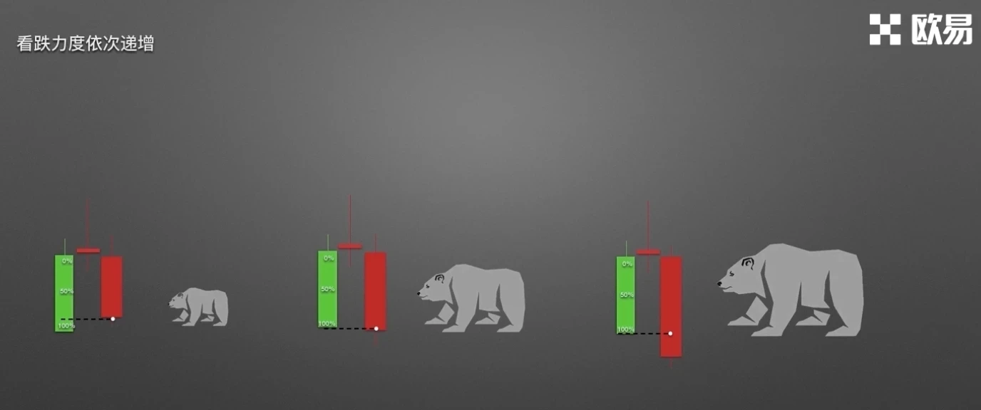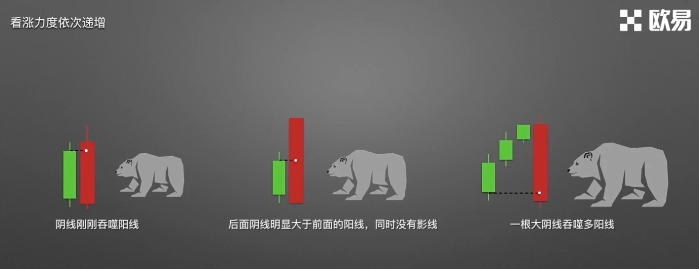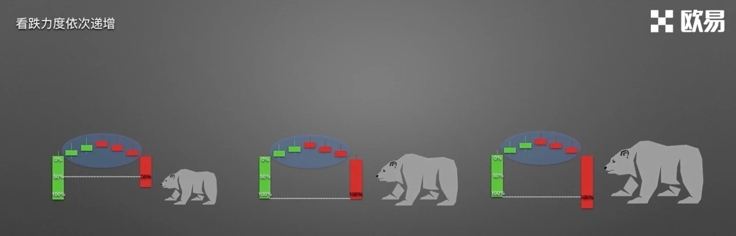 图一,下跌阴线实体刚刚将阳线实体吞没,该种情况看跌力度较弱;图二,阴线实体收盘价明显低于阳线开盘价,阴线长度甚至达到阳线的两倍,该种情况看跌力度很强;图三,阴线实体一举将多根阳线吞没,该种情况看跌力度非常强劲。