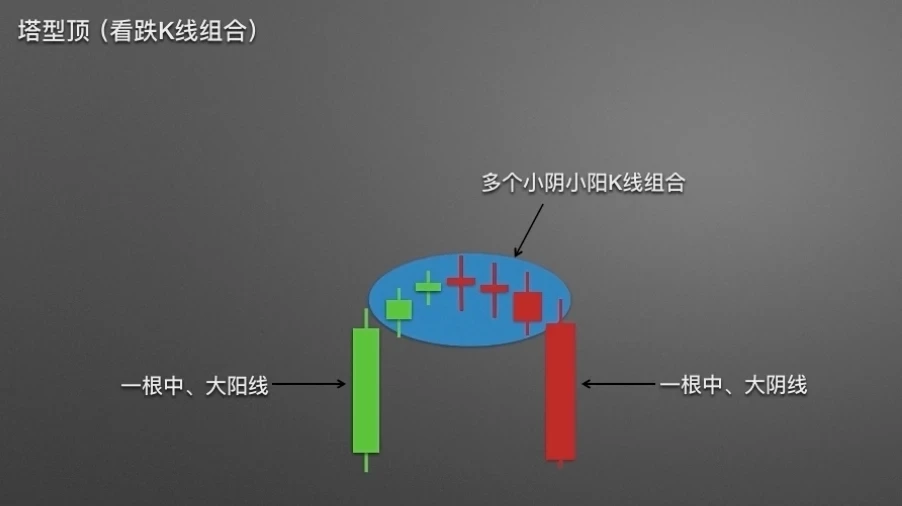 塔形顶,左边是一根中阳线或大阳线;中间由若干根小k线组成,通常在5根以上;右边是一根中阴线或大阴线。整体看上去就像一座宝塔,因此得名塔形顶。