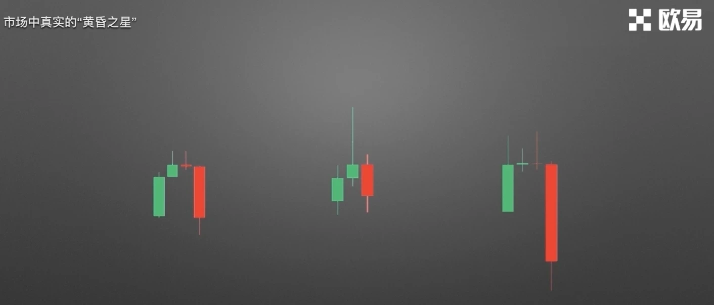 刚刚所讲是最标准的黄昏之星组合,但在实际走势中,黄昏之星会有一些变化。那么市场中真实的黄昏之星是怎样的呢?