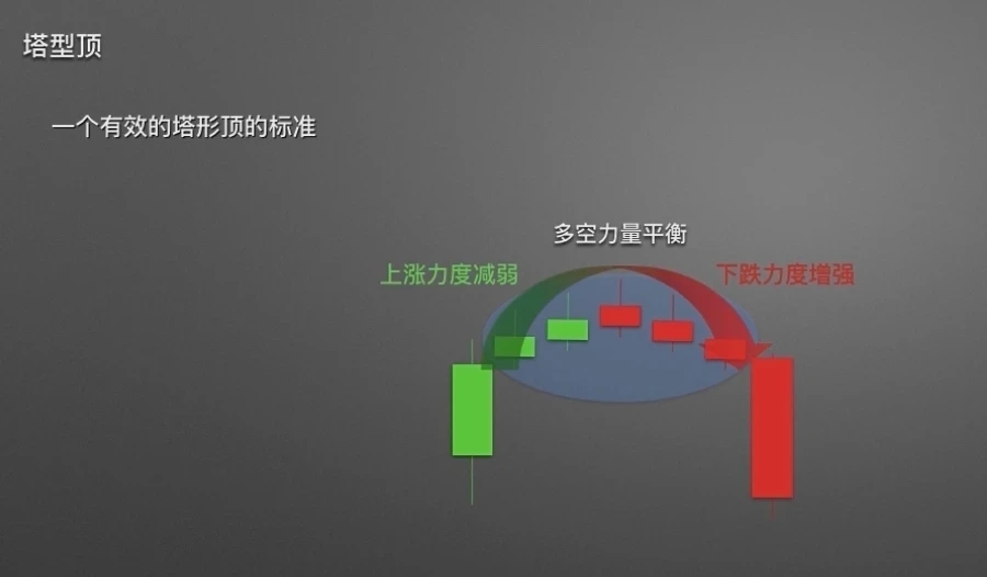 一个有效的塔形顶要满足:最后一根阴线的收盘价要低于前面大阴线实体的50%以下;塔形顶所展现的是:市场中做多力量逐步衰竭,多空达成平衡,最后到下跌力度增强的过程。