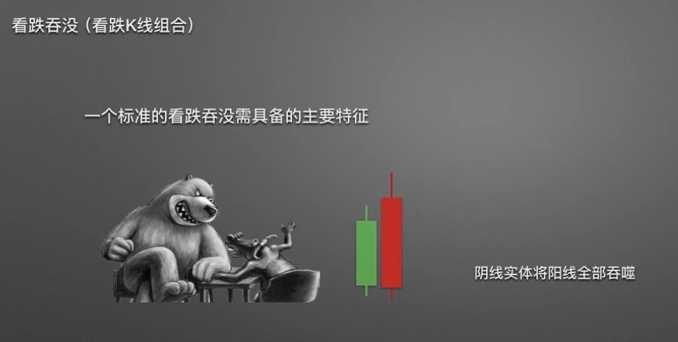 首先,看一下看跌吞没的特征。后一根阴线实体,完全覆盖前一根阳线实体,如同阳线被阴线吞噬掉一般。说明空头力量正在大举反攻。因此得名看跌吞没。