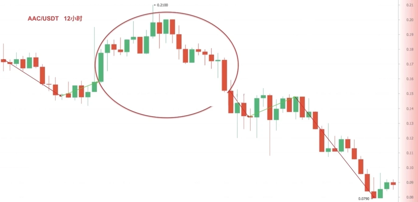 变化二,塔形顶中间部分并不都是非常小的K线构成,K线震荡幅度较大。截图来自欧易币币交易区AAC/USDT 12小时K线图,币价在一段反弹行情中出现塔形顶,随后继续大幅下跌。