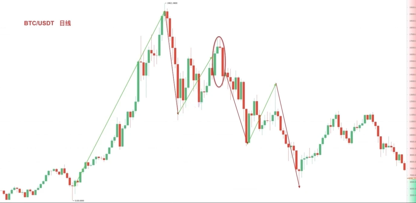 图一,中间由两根小K线组成。我们将它还原到实际走势图中。币价在大涨之后的高位区出现黄昏之星,后市币价出现大幅调整。
