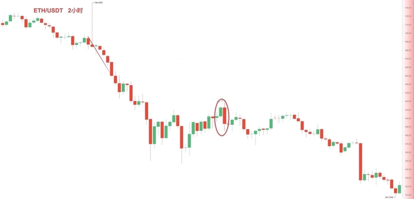 图二(截图来自欧易 ETH/USDT 2小时图),在下跌行情的反弹高点,出现看跌吞没组合,币价结束反弹继续下行。