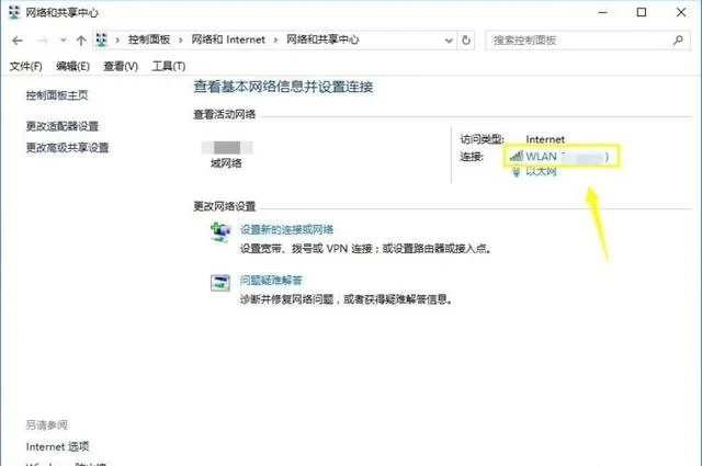 4、在网络与共享中心界面,点击当前连接的网络名称,如下图: