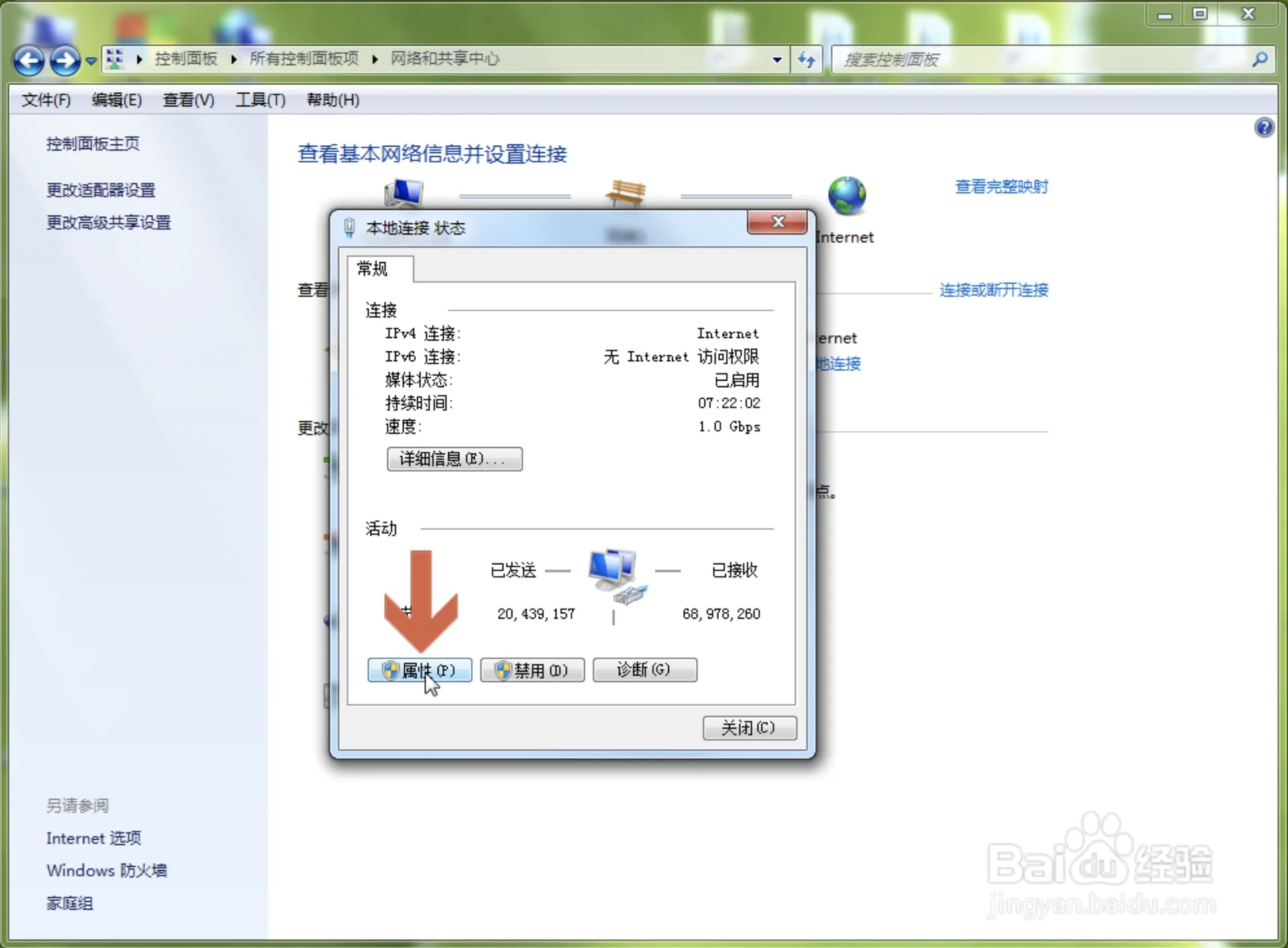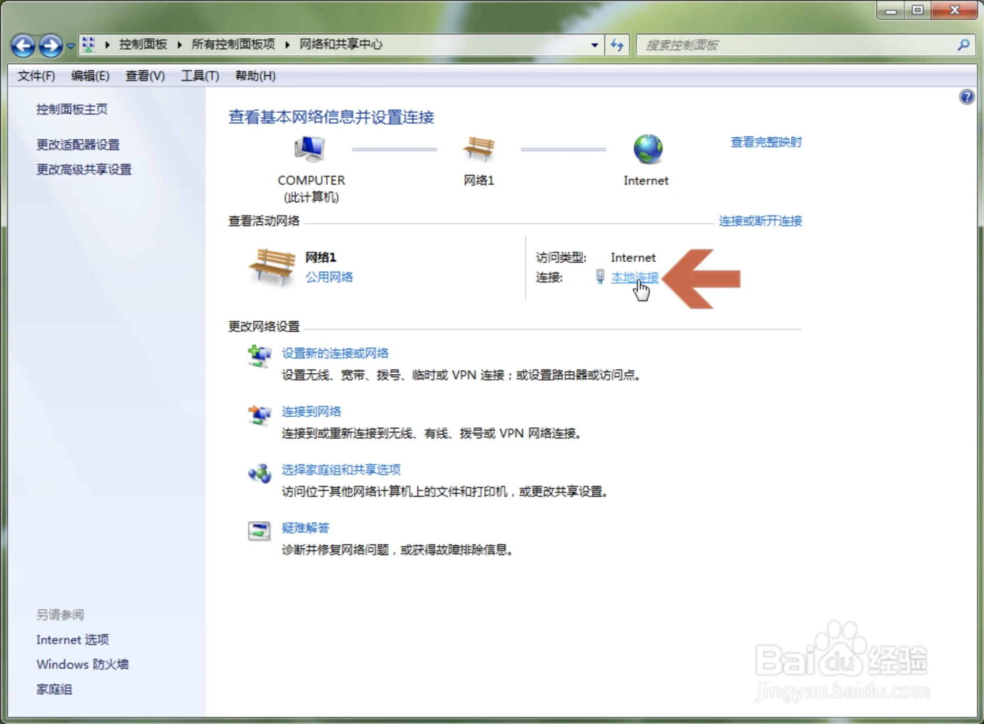 3、点击「网络和共享中心」中的「本地连接」按钮。