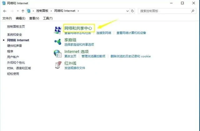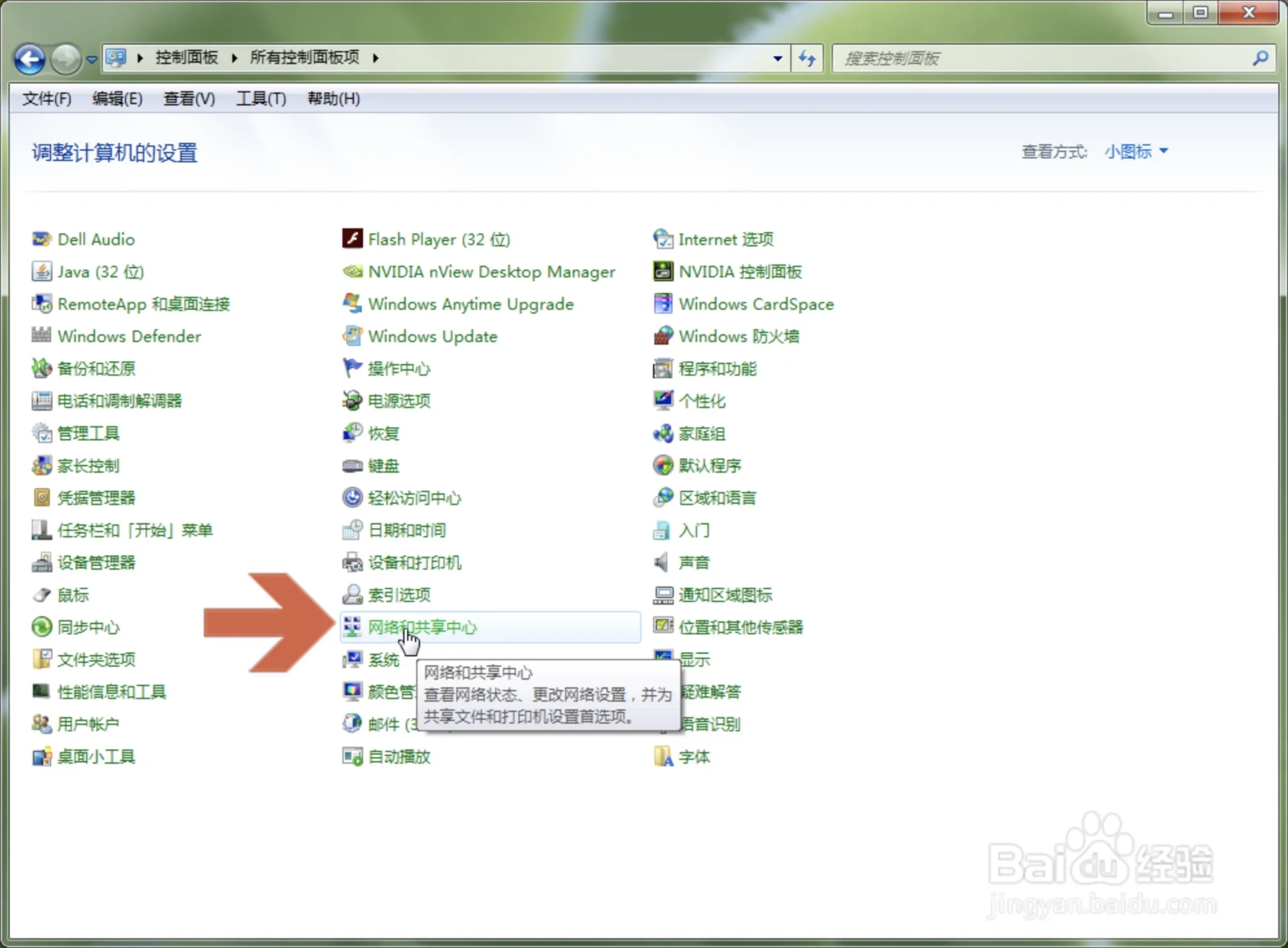 2、打开控制面板后,点击列表中的「网络和共享中心」。