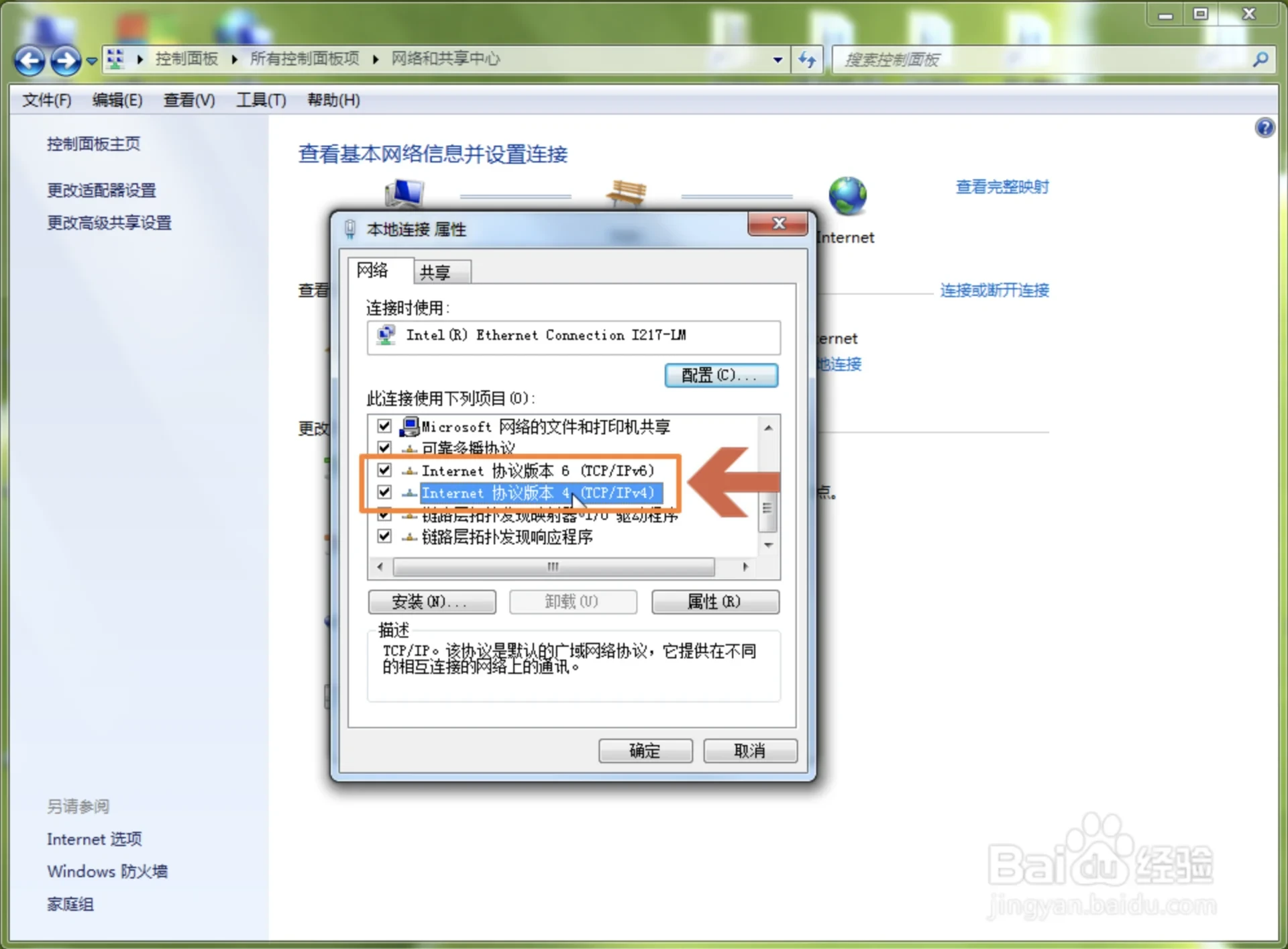5、在打开的对话框中鼠标双击要修改DNS的Internet协议名称,目前通常使用的是协议版本4。