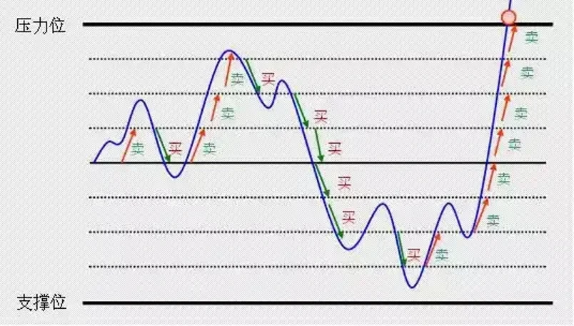 现货网格,是指利用行情震荡,在一定价格区间内绘制网格,当价格触碰到某个网格线时进行加减仓操作,低买高卖,持续交易获利。现货网格属于左侧交易,在价格下跌时买入,价格上涨时卖出。围绕一个价格中枢,不断进行高卖低买的操作。