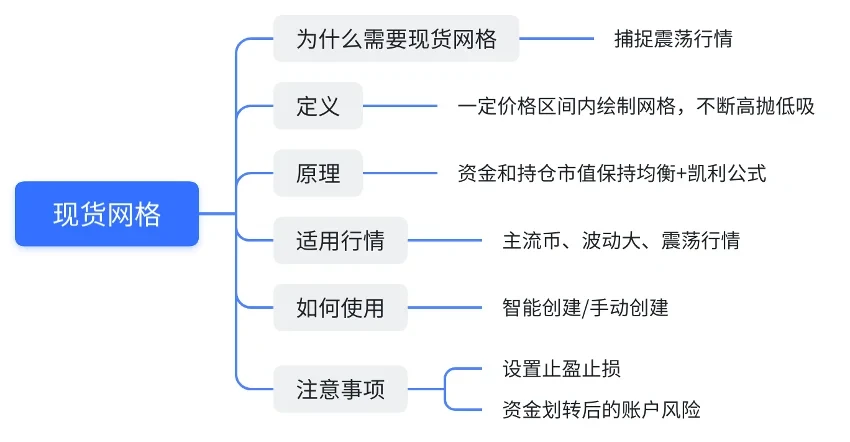 1、现货网格不是万能的,只适合震荡行情,一旦出现单边行情,如单边上涨,跑出网格区间的上沿,则会出现踏空,即错过后面的上涨行情;单边下跌,跌破网格区间的最下沿,则会出现满仓套牢的情况。价格跑出网格区间,策略都会自动停止运行。所以建议在创建策略时,同时设置止盈止损。