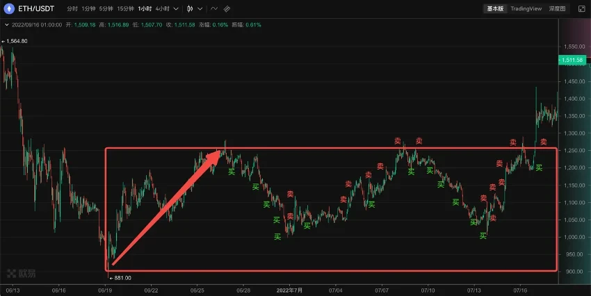 如ETH在今年6.19号创出881美元的低点,随后连续强势反弹,6.26达到1280美元附近,连续暴跌之后的强势反弹,或预示短期行情可能出现一波震荡走势。这时就可以使用现货网格策略。