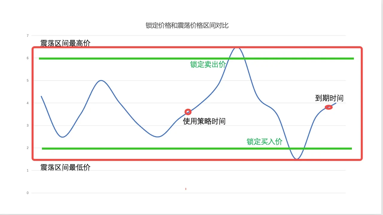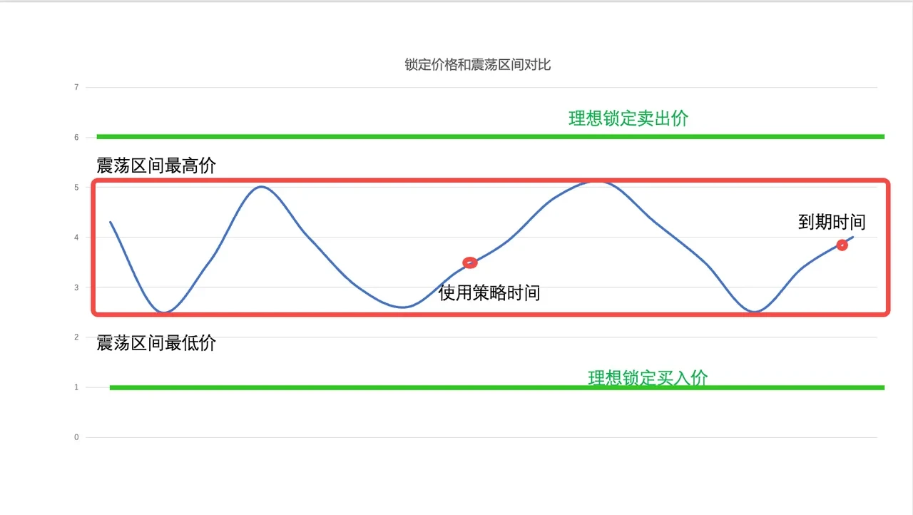 2、部分震荡行情,预期震荡的最高最低价没有超出锁定价格的范围,即买入时,预期震荡最低价大于锁定价格;卖出时,预期震荡最高价小于锁定价。这种情况,价格锁定功能,就比限价成交有优势。如下图所示: