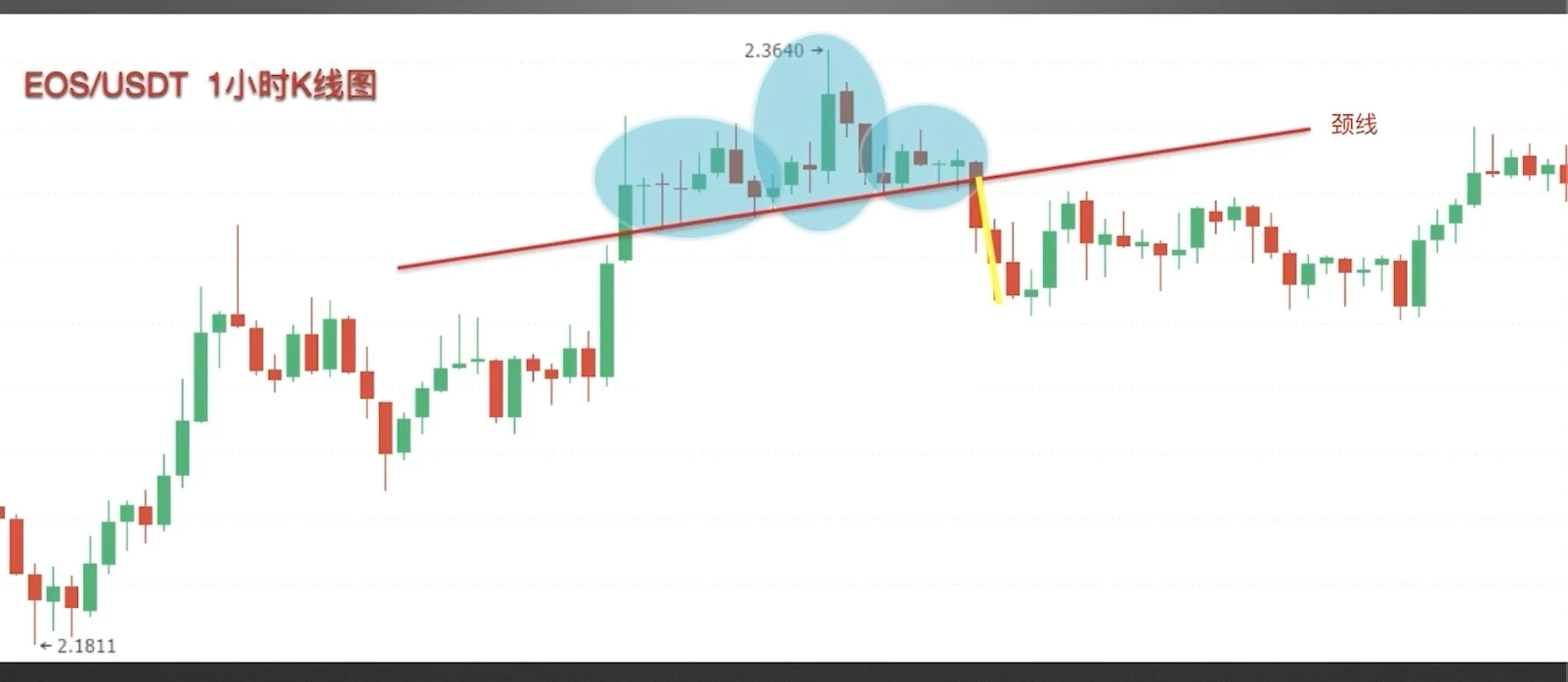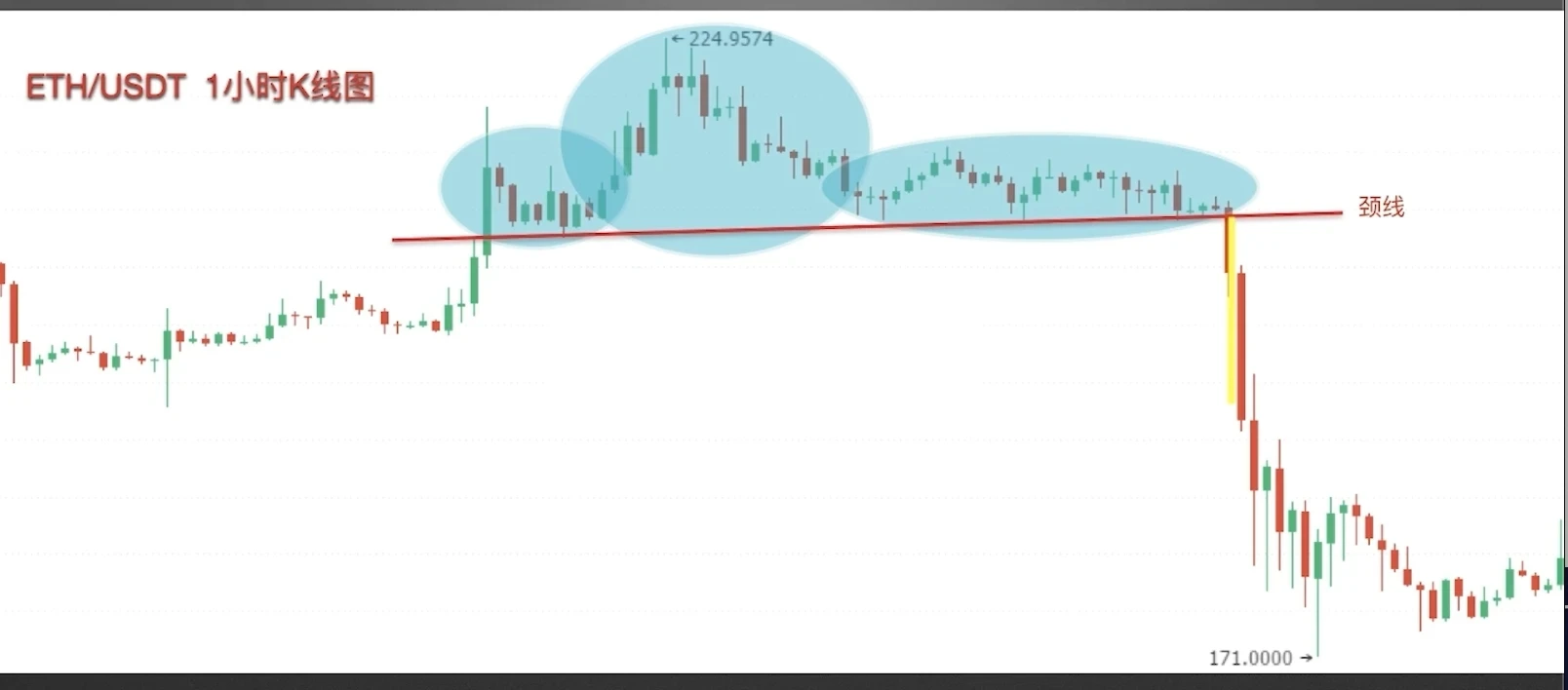 最后一个案例截图来自欧易币币交易区的以太坊兑USDT的1小时K线图,市场用了较长的时间构筑了头肩顶形态,破位颈线后价格下跌迅速,给出一次卖出机会。