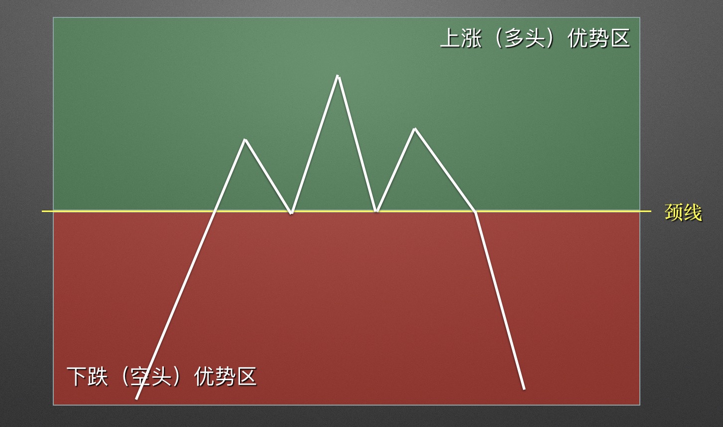 颈线之上,为上涨多头优势区,该范围内宜买涨,不宜卖空。颈线之下,为下跌空头优势区,该范围内宜卖空,不宜买涨。