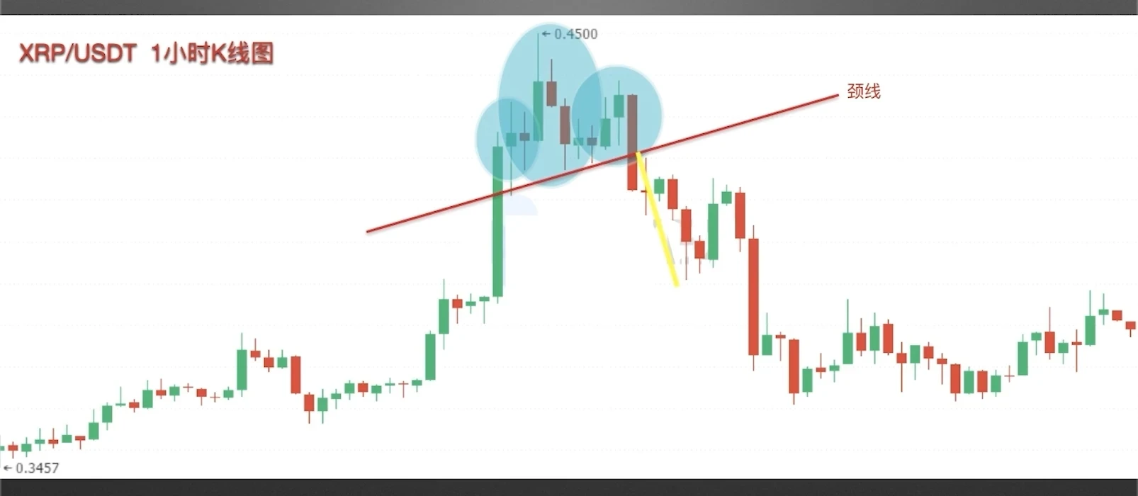 截图来自欧易币币交易区XRP兑USDT的1小时K线图,此次形成的头肩顶形态相对规整,虽然价格下破颈线迅速,但还是给出三次卖出机会。