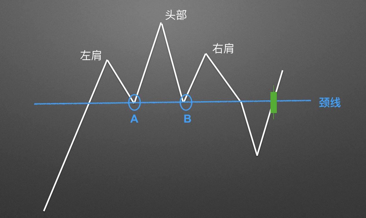 首先找到左肩和头部中间的最低点A,再找到右肩和头部中间的最低点B,两点确定一条直线,得到颈线。