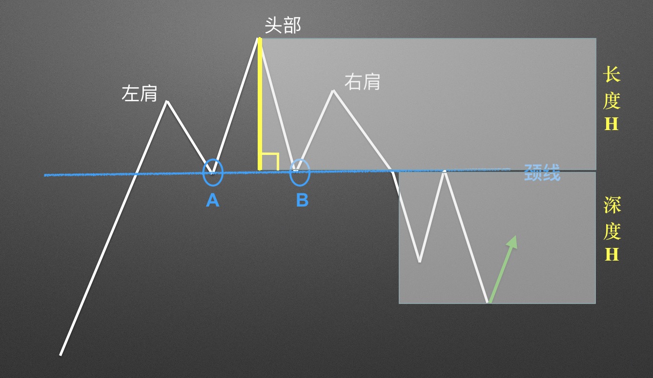 首先,我们从头部的顶点向颈线做一根垂线段,确定垂线段的长度为H。
