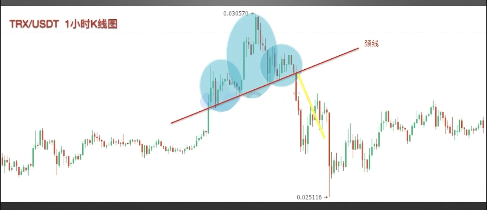 第二个案例截图来自欧易币币交易区TRX兑USDT的1小时K线图,此次形成的头肩顶形态仍是倾斜的,空头趋势表现强劲,只给出了一次卖出机会。