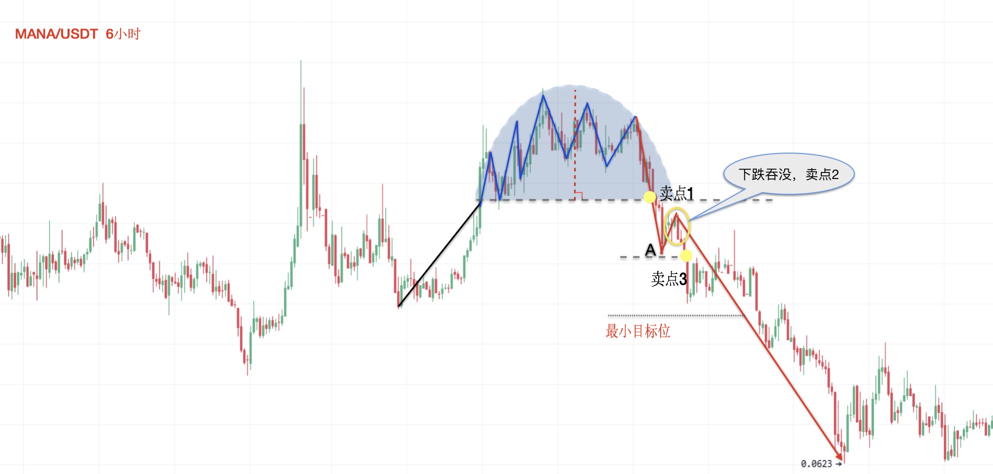 案例三:截图来自欧易 MANA/USDT 6小时图 币价在经过一段小幅上涨后形成圆弧顶,依次出现三类卖点,且最终下跌深度超过最小目标位。