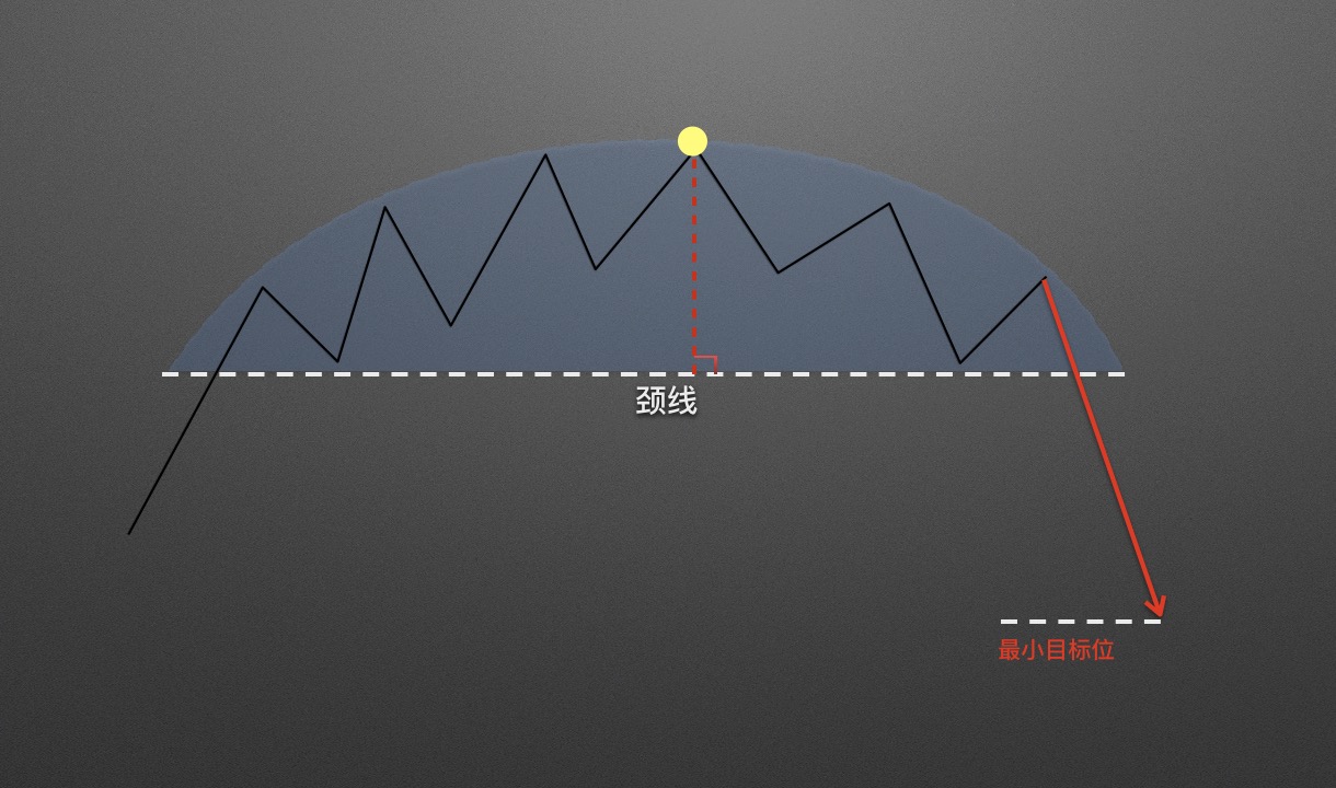 预判圆弧顶最小目标位的方法很简单。穿过圆弧的价格高点向颈线做垂线段,将线段移动至颈线之下,获得最小目标位。