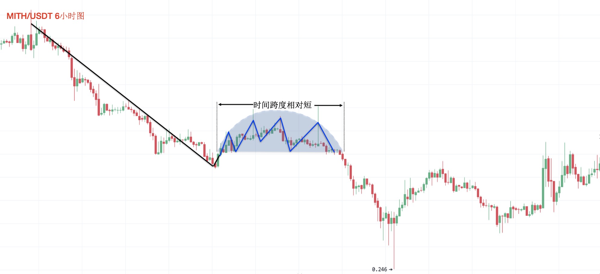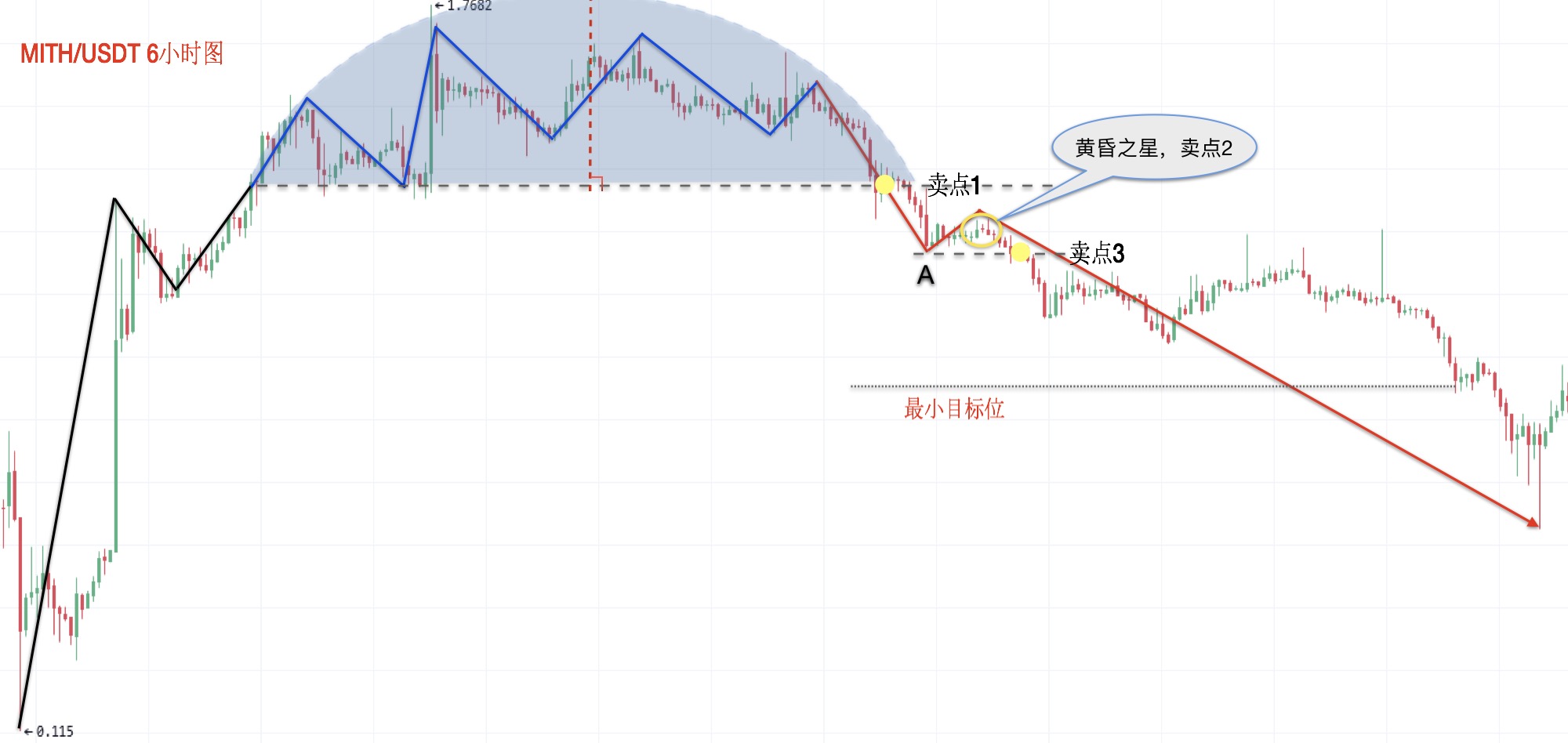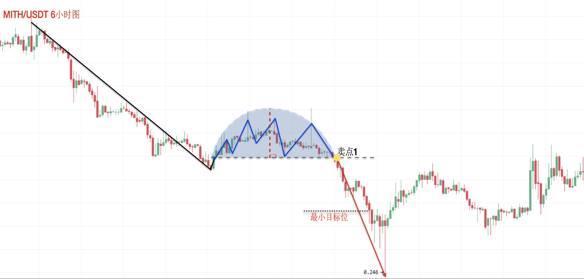 案例二:截图来自欧易 MITH/USDT 6小时图,币价在经过一段快速上涨后形成圆弧顶,并出现比较标准的三类卖点,而后币价持续回落,超越最小目标位。
