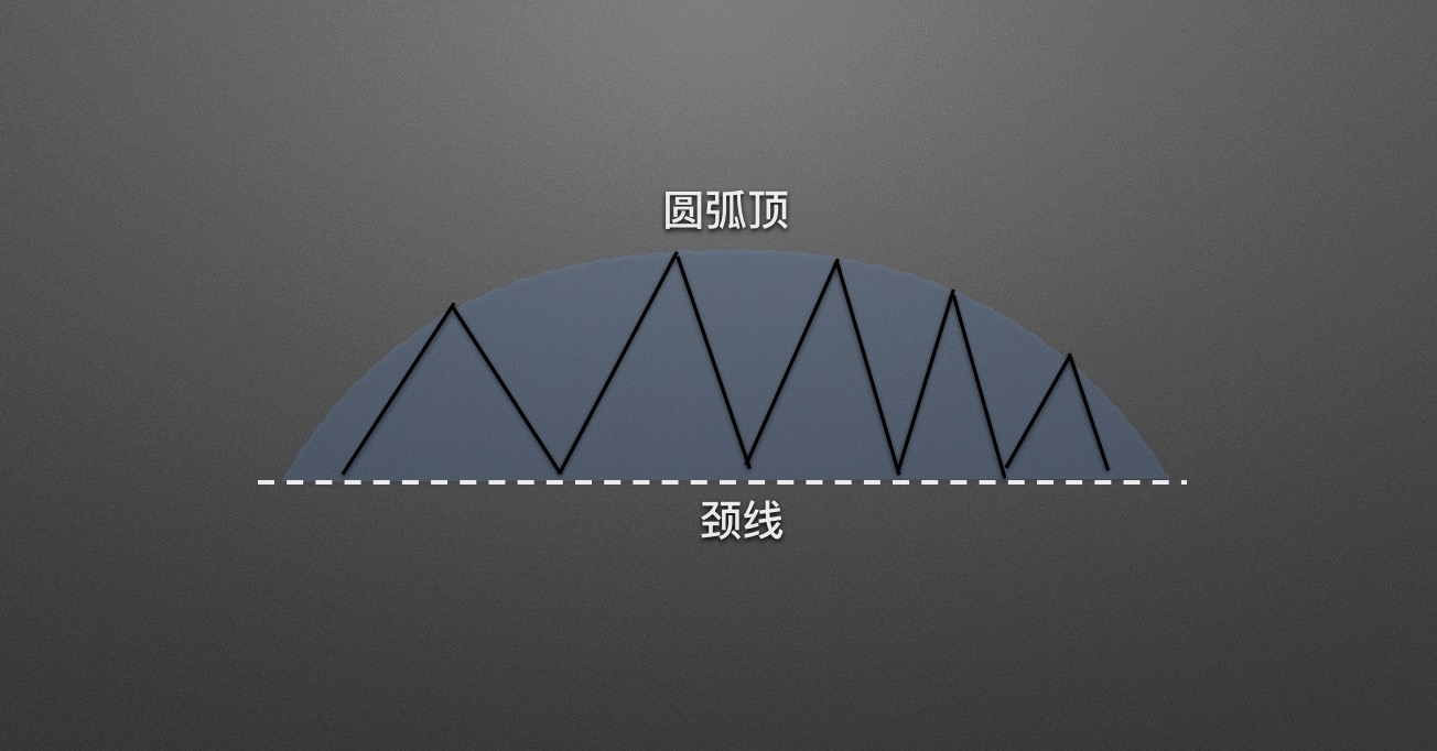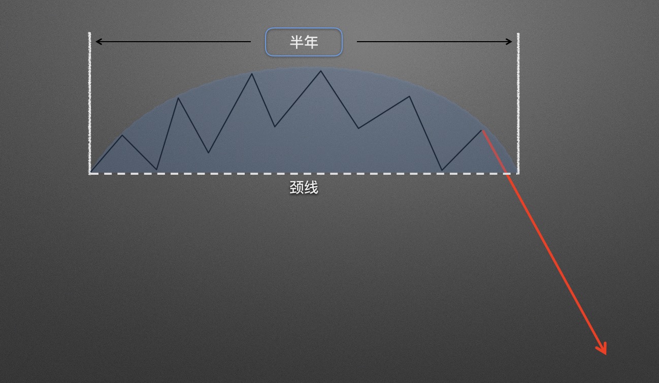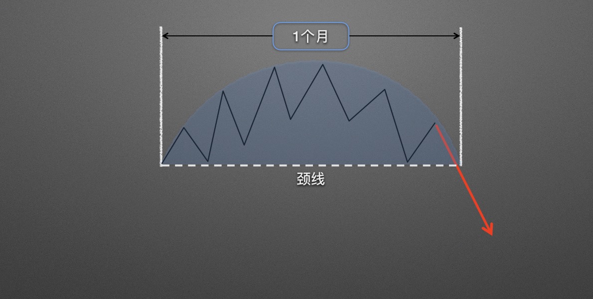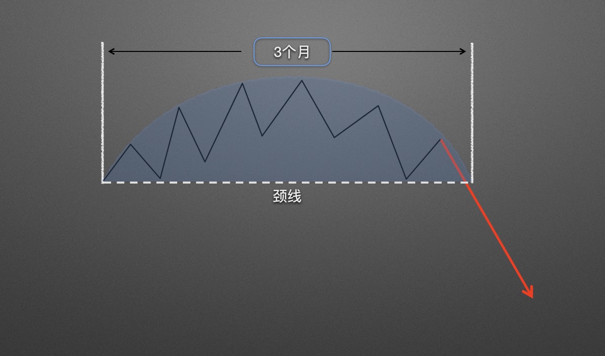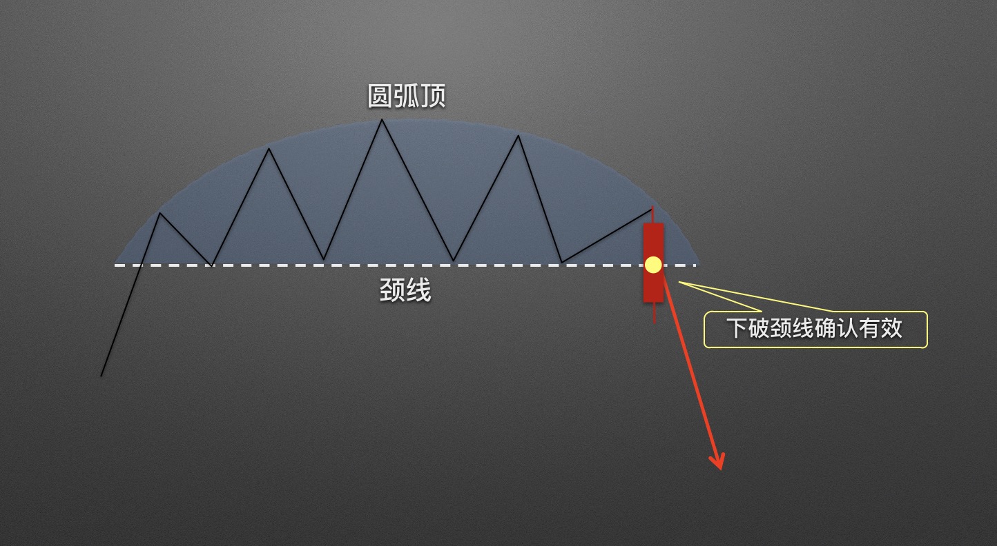如图所示:当某根K线收盘后,实体压过颈线,才可以认为圆弧顶形态成立。