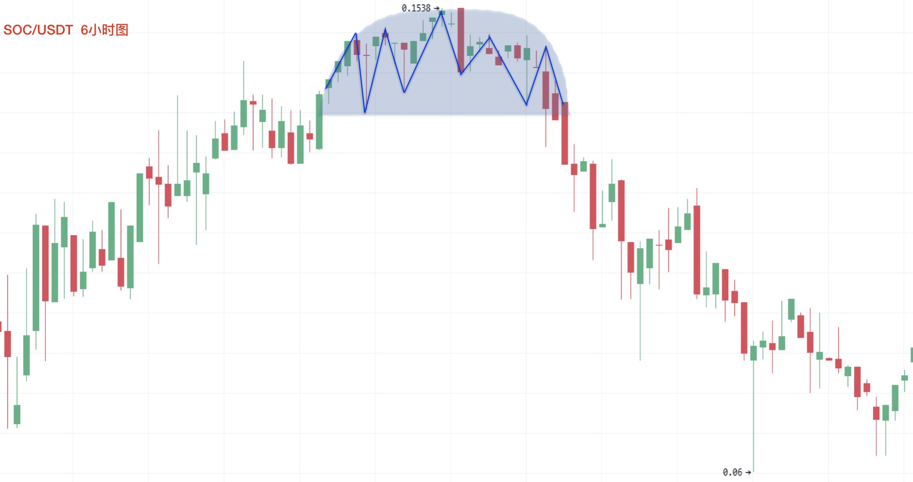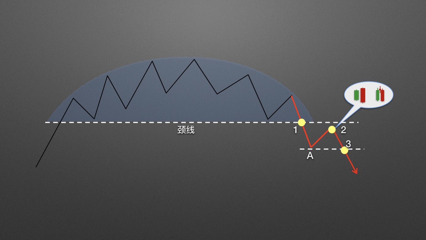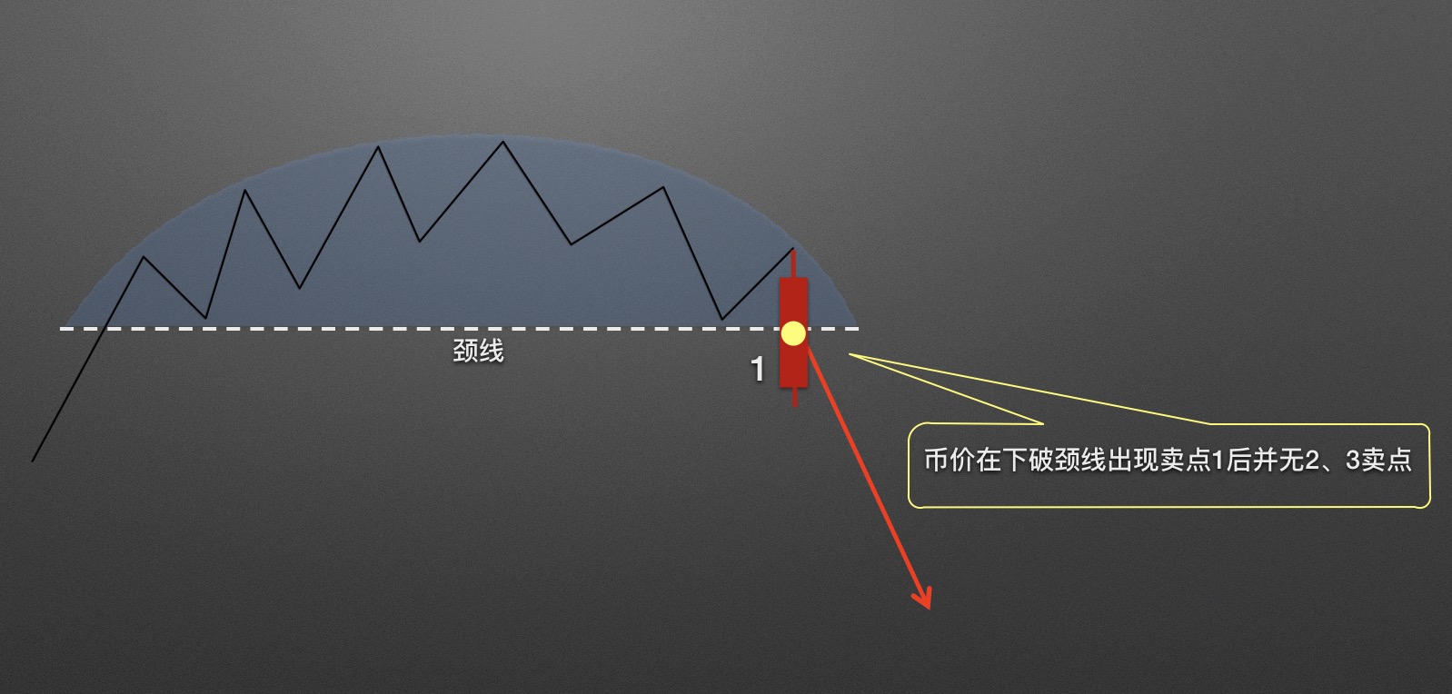 并不是每一个圆弧顶形成后都会出现三个卖点,在极度弱势的市场中极大可能只出现一个卖点。在这种情况下币价通常以一根有力的大阴线下破颈线,随后币价便一路下跌。