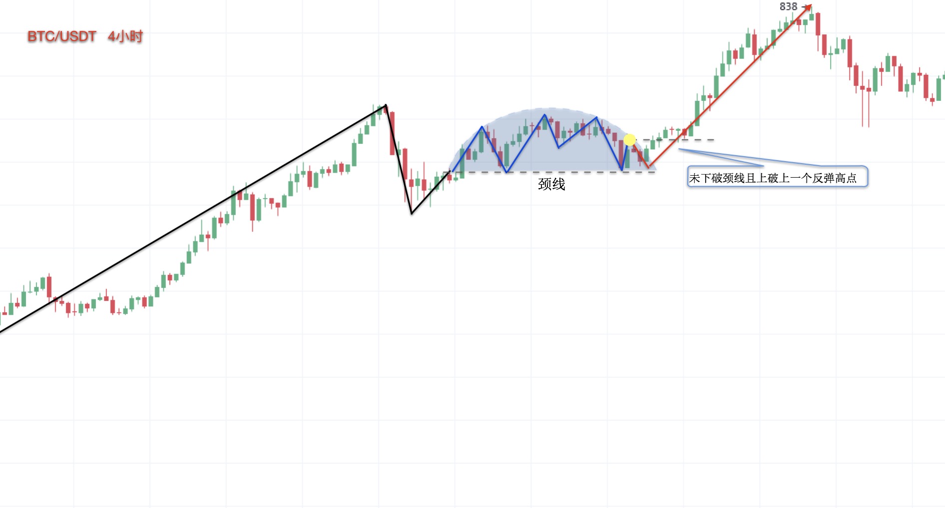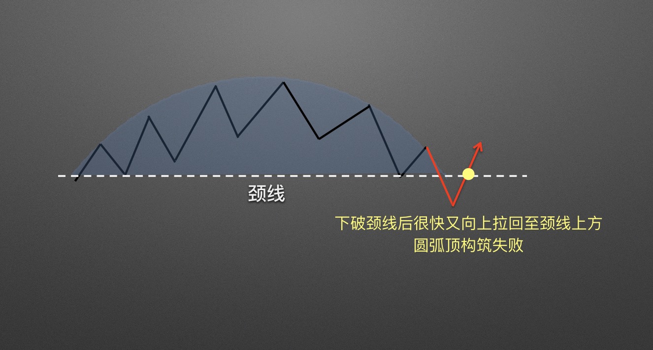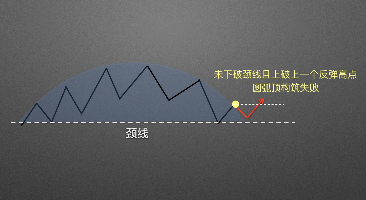 第二种情况,圆弧顶形态形成后币价并没有下破颈线,并且回升上破临近反弹高点,此时圆弧顶构筑失败。