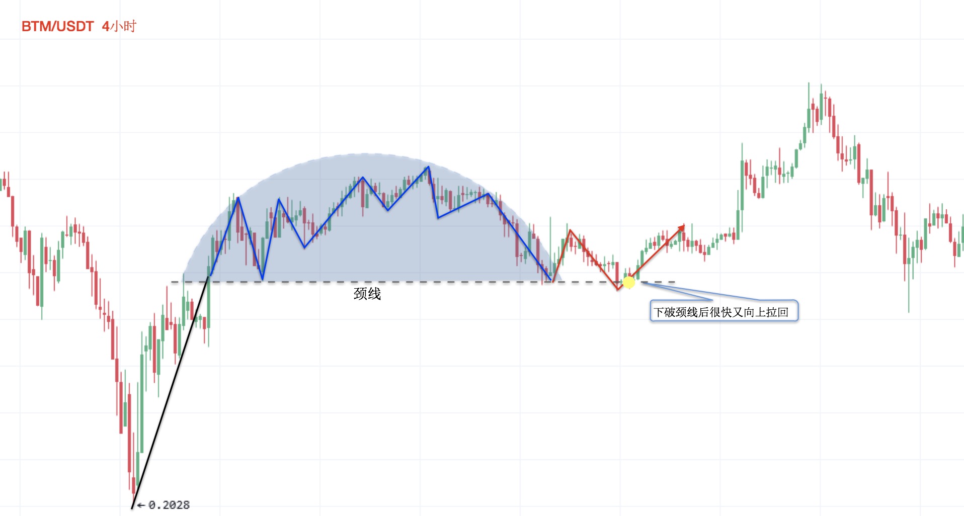 图一,币价下破颈线失败,圆弧顶形态失效,价格形成上涨。