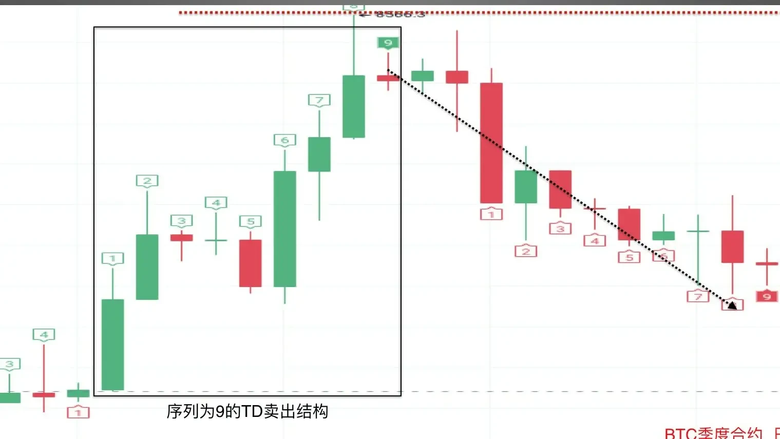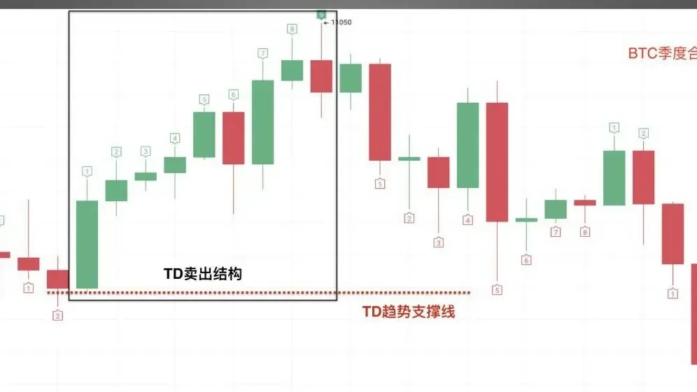 截图来自欧易 BTC季度合约日线图,TD卖出结构的形成如图所示,当连续出现9根K线,且这些K线的收盘价都比各自前面的第4根K线的收盘价高时,就形成了TD卖出结构;TD卖出结构第一根K线的最低价,就是TD卖出结构趋势支撑线,简称TD趋势支撑线。