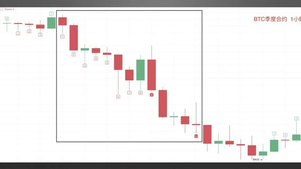 截图来自欧易 BTC季度合约日线图,由连续8根K线组成的黑色方框为中断的TD结构,当发现图中红圈所示K线收盘价未低于前第四根K线收盘价时,不满足TD买入序列计数条件,因此中断买入计数,随后开始了新的卖出序列计数。