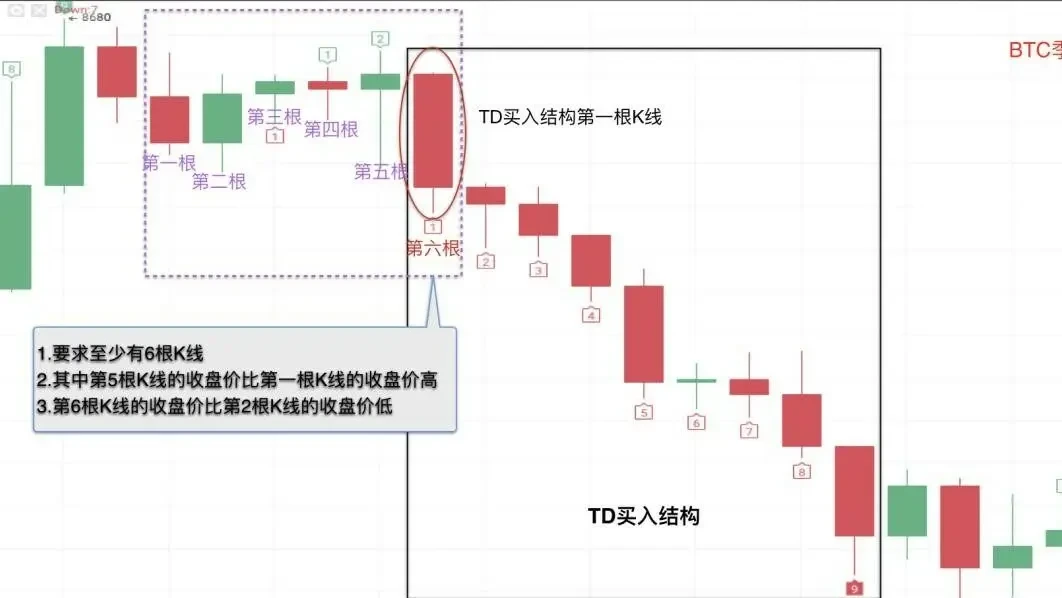 截图来自欧易 BTC季度合约日线图,TD买入结构如图中黑色线框所示,包括TD买入结构的第一根K线在内的连续6根K线区域如图中紫色虚线框所示,要求至少有6根K线,其中第5根K线的收盘价比第一根K线的收盘价高,第6根K线的收盘价比第2根K线的收盘价低,同时满足以上三个条件可确定TD买入结构第一根K线。