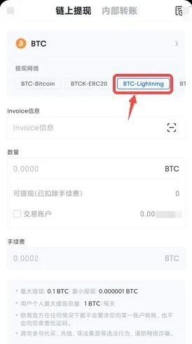 三、提币币种选择“BTC”,提币方式选择“闪电网络”,即Lightning网络。
