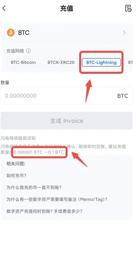 三、充币币种选择“BTC”,充币方式选择“闪电网络”,即Lightning网络。